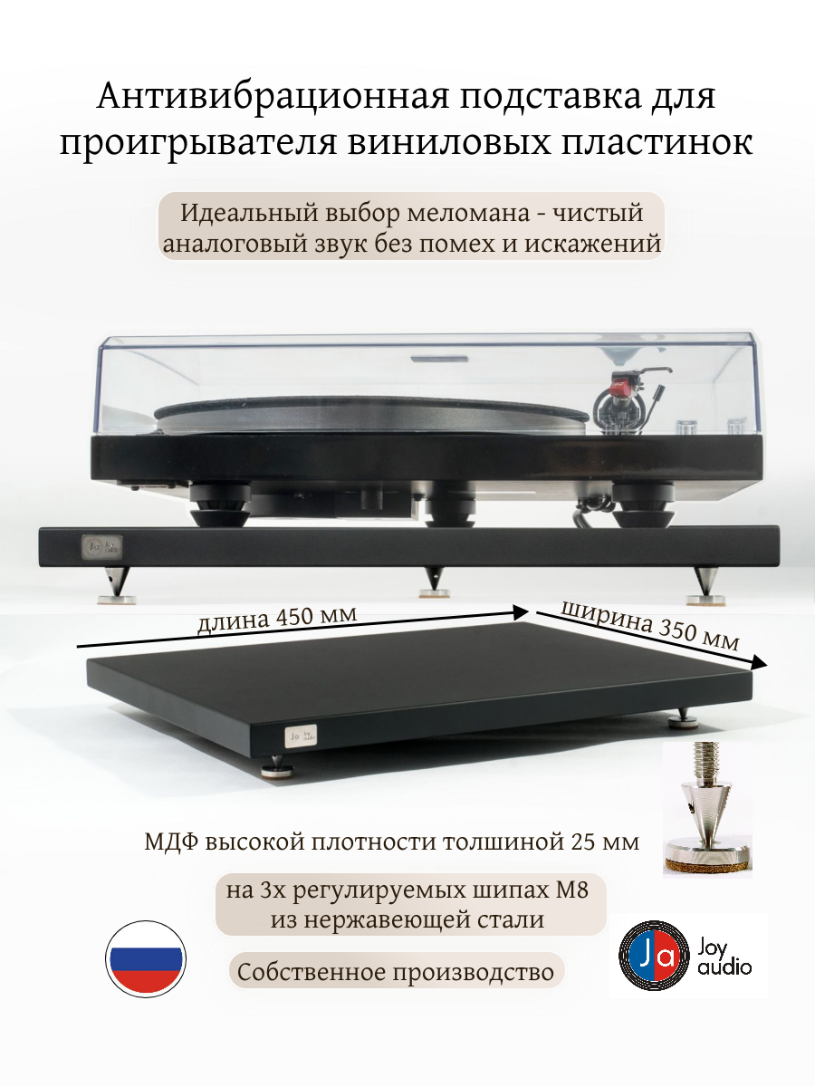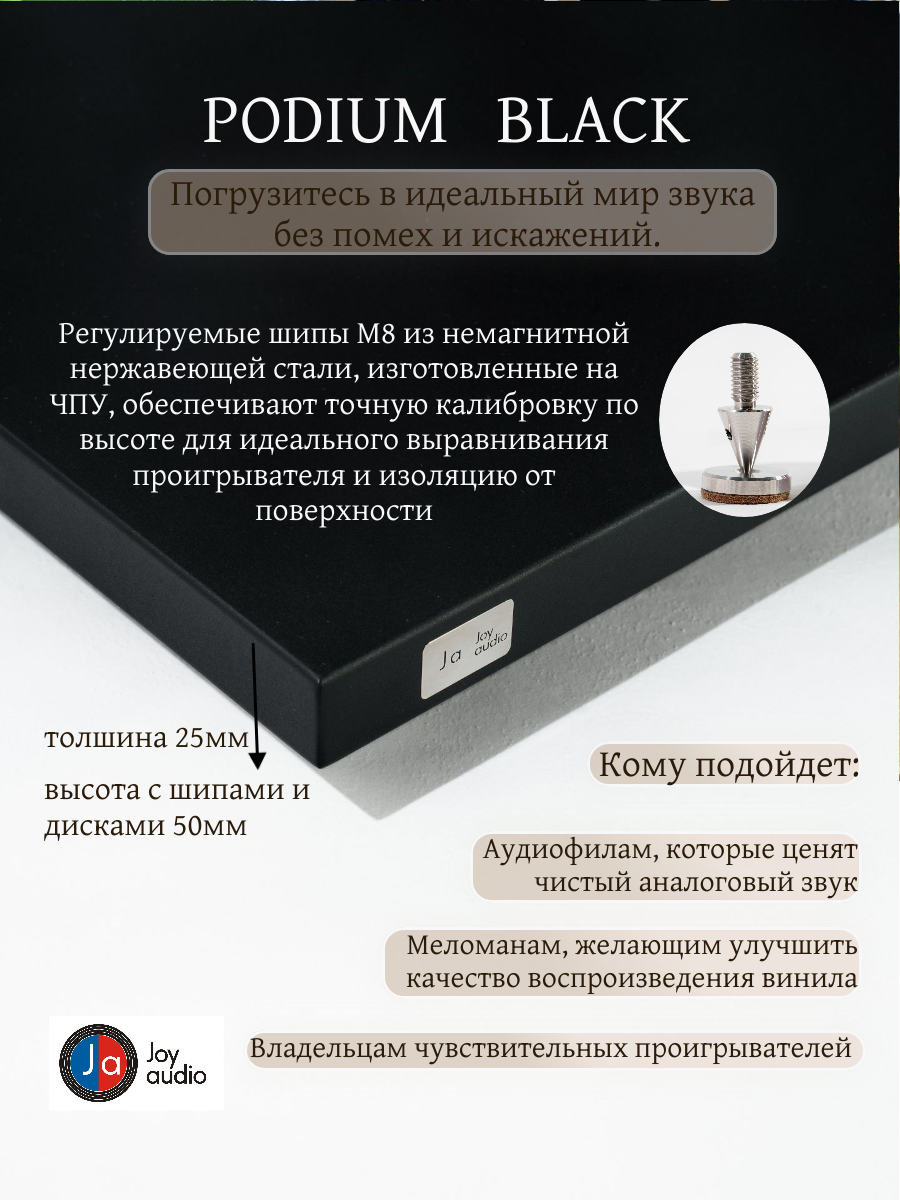 Подставка для винилового проигрывателя с антивибрационной системой Очевидный выбор - Чистый аналоговый звук, достойный Вашей коллекции винила. Погрузитесь в идеальный мир звука - без помех и искажений. Эта профессиональная подставка создана для настоящих ценителей винила. Она нейтрализует вибрации и минимизирует резонанс, обеспечивая максимально детальное и чистое звучание ваших пластинок. Стильный минималистичный дизайн в благородном черном матовом оттенке делает подиум уникальным украшением любой системы.