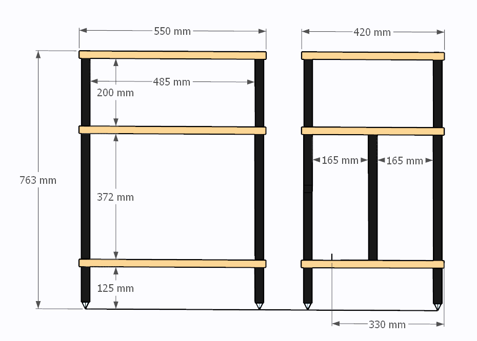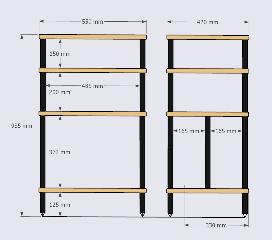 Расстояние между полками: 3 этажа - 372 и 200 мм; 4 этажа - 372 мм, 200 мм и 150 мм (смотрите схему в фотогалерее)