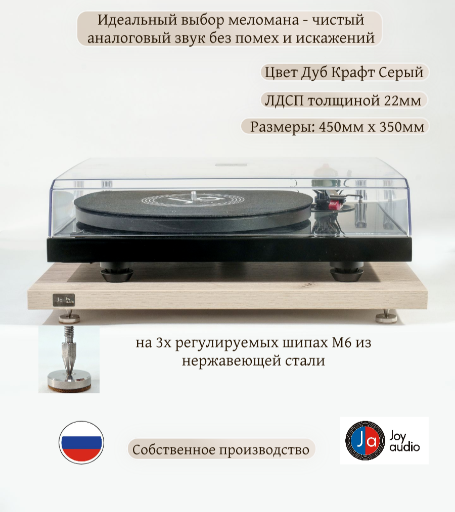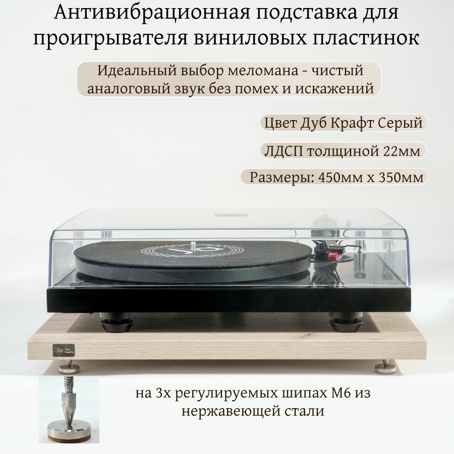 Подставка для винилового проигрывателя с антивибрационной системой Очевидный выбор - Чистый аналоговый звук, достойный Вашей коллекции винила. Погрузитесь в идеальный мир звука - без помех и искажений. Эта профессиональная подставка создана для настоящих ценителей винила. Она нейтрализует вибрации и минимизирует резонанс, обеспечивая максимально детальное и чистое звучание ваших пластинок. Стильный минималистичный дизайн в цвете дуб серый сделает подиум уникальным украшением любой системы.