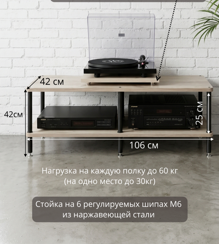 Простая сборка, инструкция в комплекте. Собственное производство на территории РФ. Цена указана за стойку. Podium для проигрывателя, подставка под пластинки, стенды для полочной акустики и иные аксессуары на фото товара в комплект стойки НЕ входят и продаются отдельно.