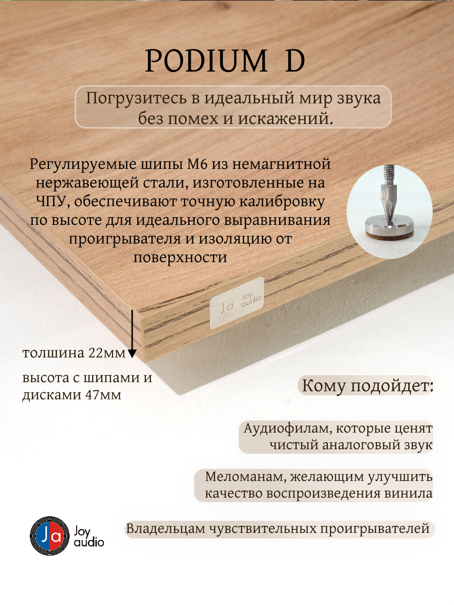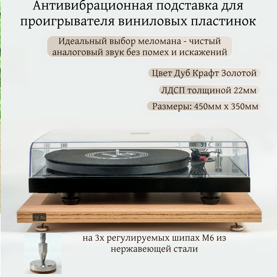 Подставка для винилового проигрывателя с антивибрационной системой Очевидный выбор - Чистый аналоговый звук, достойный Вашей коллекции винила. Погрузитесь в идеальный мир звука - без помех и искажений. Эта профессиональная подставка создана для настоящих ценителей винила. Она нейтрализует вибрации и минимизирует резонанс, обеспечивая максимально детальное и чистое звучание ваших пластинок. Стильный минималистичный дизайн в цвете дуб крафт золотой сделает подиум уникальным украшением любой системы.